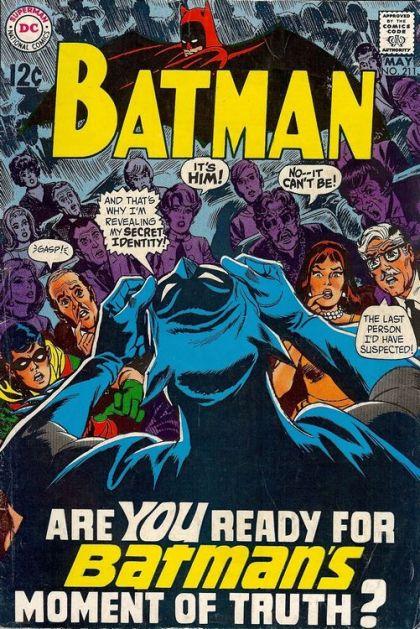 The underground newspaper, It's Your Bag, prints the faces of four men beside Batman's face, and asserts one of them is Batman and that they will reveal his true identity in the next issue. Scribe, the writer of the article, assures his chief that even though he does not know who Batman really is, Batman will have to unmask to save the rest (including underworld kingpin Spooks Manson) from becoming gangland targets. Batman throws them a curve by going on television and unmasking, revealing himself as reclusive billionaire Howard Hayes. He does so with Hayes's permission, and It's Your Bag goes out of business. Spooks Manson orders his men not to fight Batman until he can figure out what angle the Caped Crusader has planned. Thus, Batman finds a lot of thugs surrendering to him without a fight. Hayes, watching Batman feted on TV, realizes that Batman has gotten the one thing he always wanted, public acclaim, by posing as Hayes himself. He vows to eliminate Batman quietly and take his place. After brushing up on martial arts and Samurai swordsmanship, Hayes summons Batman to meet him in battle. Batman initially triumphs, but is so stunned to find Hayes beneath his foe's hood-mask that Hayes is able to turn the tables, trap him, and make his way to an awards dinner as Batman. Robin and Alfred save Batman from a deathtrap, and Batman arrives at the dinner in time to clobber Hayes, reveal the masquerade, and receive the award himself.