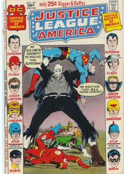 On Earth-Two, members of the Justice League and Justice Society team up against Solomon Grundy who has been coerced by an alien looking for his lost pet with which he shares a symbiotic relationship.On the League satellite, Black Canary tends to Flash who has been injured during the fight.The Hawkman and Robins of both Earths find the alien who had stolen Green Lantern's ring and manage to subdue him while the two Lanterns tackle Solomon Grundy.On both Earths, the heroes realise that the alien and his pet weakened at the same time and so bring them together, restoring them to health.