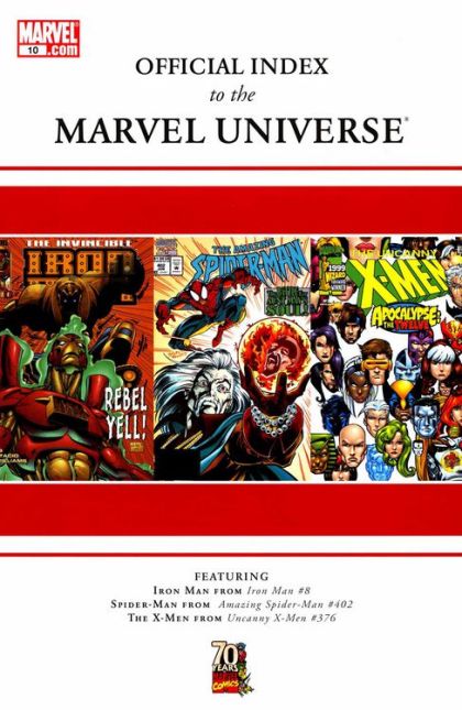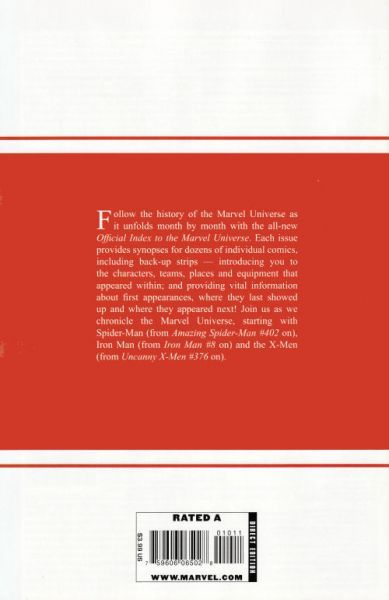 Written by VARIOUS Continuing the chronicle of the Marvel Universe, starting with Spider-Man (from AMAZING SPIDER-MAN #429 on), Iron Man (from IRON MAN ANNUAL 1999 on) and the X-Men (from UNCANNY X-MEN #416 on). Follow the history of the Marvel universe as it unfolds month by month with the All-New Official Index to the Marvel Universe. Each issue provides synopses for dozens of individual comics, including back-up strips, introducing you to the characters, teams, places and equipment that appeared within, providing vital information about first appearances, where they last showed up and where they appeared next! 64 PGS./Rated A ?$3.99