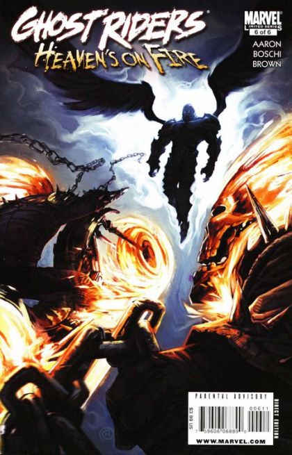 HEAVEN'S ON FIRE #6 (of 6) Written by JASON AARON Penciled by ROLAND BOSCHI Cover by CHRISTIAN NAUCK Writer Jason Aaron's hellblazing, heaven-burning run on GHOST RIDER roars to its dramatic conclusion with a confrontation that's been a long time coming. In one corner, we have the Ghost Rider brothers, Johnny Blaze and Danny Ketch. In the other corner is Zadkiel, the renegade angel. And before the battle is through, you can rest assured that blood will flow on the golden streets of heaven. And no matter who wins, will it mean the end for America's favorite Flameheads? 40 PGS./New & Reprint/Parental Advisory ?$3.99