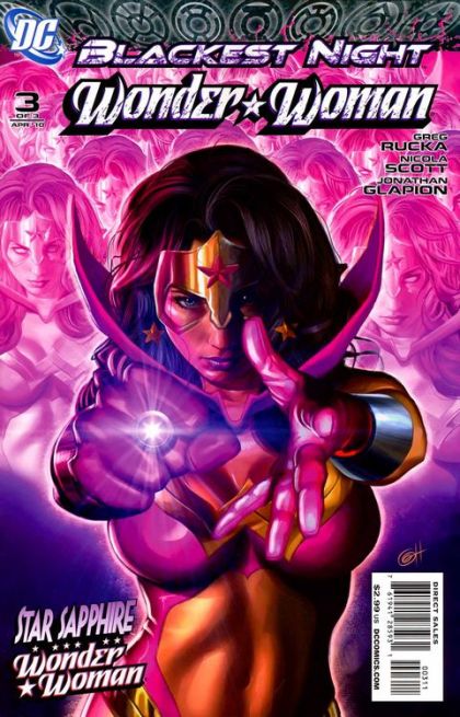 Wonder Woman has been freed of the Black Ring by the Violet Light of Love. But that light isn't strong enough to overcome the Black Lanterns on it's own. As she and Carol fight their way towards the other Lanterns and deputies, she comes across Mera, newly claimed by the Red Ring. But Mera is in such a fury that her wrath isn't for the Black Lanterns alone. She attacks Diana as well. Using her ring, Wonder Woman searches Mera's heart for Love, but finds nothing. But when she entangles Mera with her lasso, combined with the Ring, she finds the truth of Mera's hatred.