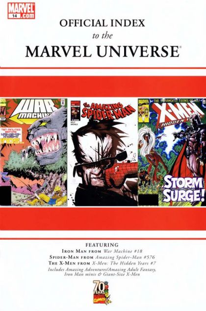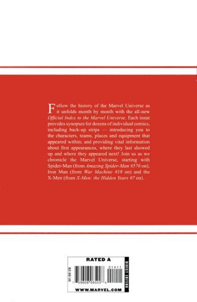 Written by VARIOUS Continuing the chronicle of the Marvel Universe, starting with Spider-Man (from AMAZING SPIDER-MAN #580 on), Iron Man (from WAR MACHINE #15 on) and the X-Men (from CLASSIC X-MEN #20 on). Follow the history of the Marvel universe as it unfolds month by month with the All-New Official Index to the Marvel Universe. Each issue provides synopses for dozens of individual comics, including back-up strips, introducing you to the characters, teams, places and equipment that appeared within, providing vital information about first appearances, where they last showed up and where they appeared next! 64 PGS./Rated A ?$3.99
