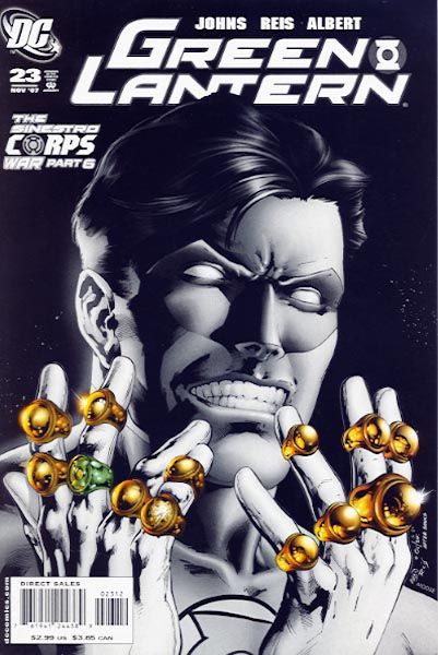 In Coast City, the family of Hal Jordan's brother worry that no-one is returning to the rebuilt city.On Qward, Jordan faces off against Lyssa Drak and battles her until his ring is almost out of power but is rescued by the arrival of John Stewart and Guy Gardner. Needing a weapon, Jordan uses the nearby Qwardian power rings.On Oa, the Guardians banish Ganthet and Sayd, claiming that they have fallen prey to emotion.Back on Qward, the Lost Lanterns find Ion being tortured by the Anti-Monitor. Before they can attack, Ke'haan is killed by the Anti-Monitor, enraging Hannu into attacking him and temporarily forcing him back. As Amon Sur arrives, he encounters Jordan and his comrades. Their battle is quickly joined by Sinestro and Parallax and while Jordan may have the strength to spark the yellow Qwardian rings, Sinestro shows him that he has no idea how to control them. The Lanterns are attacked by Sinestro and Parallax but are interrupted by the arrival of the surviving Lost Lanterns and Ion who, in turn, are pursued by the Anti-Monitor. The Lanterns escape and split up, returning to the positive matter universe with the Lost Lanterns and Ion heading for Oa while Jordan, Gardner and Stewart head to Earth.Sinestro sends Parallax on ahead as the Qwardians begin mobilising and the Guardians prepare to defend Oa. The first measure to defend them is to enable lethal force for the Green Lanterns against the Sinestro Corps. However, the Lantern Corps are gathered in the wrong place as Jordan and the others realise when thousands of Sinestro Corps members appear above Earth.