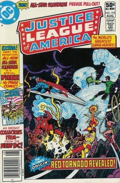 Having overheard T O Morrow's explanation of Red Tornado's origin, Aquaman attacks but is knocked unconcious before Morrow and Tornado escape. The League, unable to find Tornado, discover Aquaman frozen and rush to help him. Morrow in attempting to discover what makes Tornado unique, analyses him using a computer from the future but is overwhelmed by something. Aboard the JLA satellite, Aquaman is freed from the frozen casing and reveals Morrow's plan to dismantle Tornado. The League waste no time in finding him, demanding to know what has happened to the now missing Tornado. When Morrow attacks them, he is in turn attacked by a giant, humanoid tornado that the League identify as the Tornado Tyrant. The Tyrant then attacks the League, defeating all except Firestorm who is contacted by the Tornado Champion, an aspect of the Tyrant that had become good. The Champion explains that he emulated the League and had previously travelled to Earth-Two when Morrow had first created the Red Tornado, taking advantage of the android and merging with him. Both the Champion and the Tyrant had been released when Morrow had used the futuristic computer to analyse the android and the only way to defeat the Tyrant was to merge the two beings once more in Red Tornado. Firestorm merges the two tornados resulting in Red Tornado returning to life.