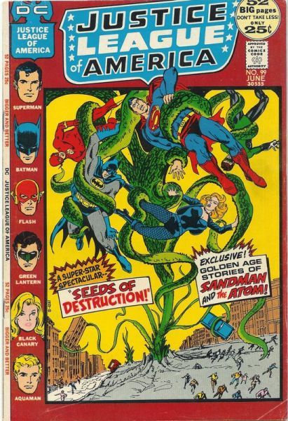 "Seeds of Destruction!": The Justice League members are attacked by marauding giant plants when an alien "Johnny Appleseed" and his son come to Earth in a misguided attempt to restore its ecological balance. The heroes are unable either to stop the damage being done by the extraterrestrial plants, or to convince the visitors that they are doing more harm than good, until they pretend to assist in the planting campaign. The aliens are then deprived of their power-staffs, without which even they cannot survive in the environment being created by their plants. Realizing their error, they depart for their own world.