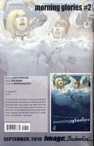 The most anticipated new series of the year starts here! Morning Glory Academy is one of the most prestigious prep schools in the country? But behind it's hallowed doors something sinister and deadly lurks. When six brilliant but troubled new students arrive, they find themselves trapped and desperately seeking answers in a place where nothing is what it seems to be! TAG: DOUBLE SIZED FIRST ISSUE, 44 FULL PAGES OF STORY FOR JUST $3.99! IT'S RUNAWAYS MEETS LOST! FROM THE WRITER OF EXISTENCE 2.0, FORGETLESS, AND SHUDDERTOWN!