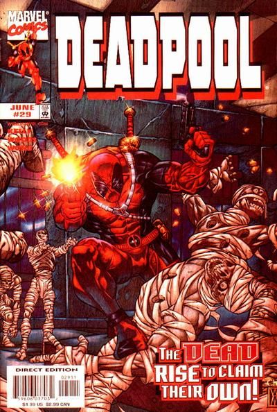 Cover art by Walter McDaniel. ake My Wife... Please! (or Cock-A-Voodle-Doo), script by Joe Kelly, pencils by Pete Woods, inks by Walden Wong and Rebecca Shelander; DP is reunited with his wife from his pre-merc life but their reunion bliss is interrupted by the Black Talon and a horde of zombies; Pool takes down the Talon but not before he learns that the zombie master believes Mercedes to be undead. 36 pgs. $2.99. Cover price $1.99.