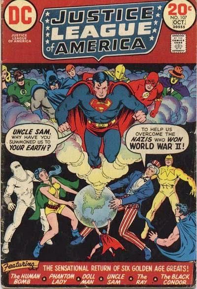 The Justice League and Justice Society test the Trans-matter Cube, a new device for travel between their parallel Earths, but the machine malfunctions when the Red Tornado stows away, in an attempt to return to his home world. Batman, Green Arrow, and Elongated Man, together with Dr. Fate, Sandman, and Superman of Earth-2 are hurled into Earth-X—yet another parallel world, where the Nazis won World War II, and have invaded America. They are rescued from attacking German soldiers by the Freedom Fighters, the last surviving super-heroes of this world: Doll Man, Phantom Lady, Human Bomb, Black Condor, the Ray, and Uncle Sam. Dr. Fate pinpoints the locations of a series of mind-control ray-projectors used by the Nazis to consolidate their conquest, and the three teams of heroes unite to destroy them. Batman, Dr. Fate, the Ray, and the Human Bomb invade the Eiffel Tower, and battle four demonic creations of a Nazi computer, but the destruction of the first mind-control device yields no positive results.