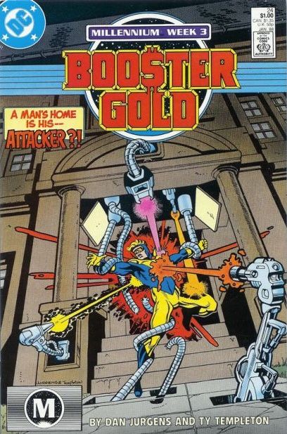 Booster Gold finds himself attacked by his own mansion. He fights back, only to realize that there is a Manhunter in his inner circle, and he has been bled dry.