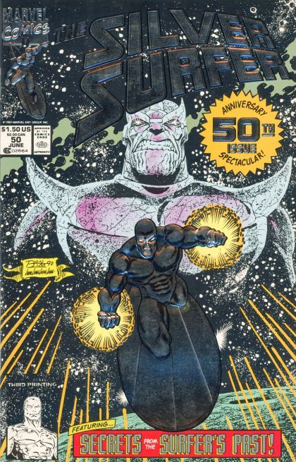 The Silver Surfer encounters a facsimile of Thanos, and is taunted by the mad titan's newfound power. Thanos uses this power to plumb the depths of Norrin's memories, and drives the Surfer to the brink of his nobility.