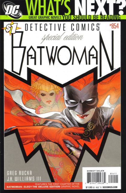 Written by GREG RUCKA Art and cover by J.H. WILLIAMS III Co-feature art by CULLY HAMNER A new era began with the first Batwoman adventure in DETECTIVE COMICS, now reprinted for just $1.00! Kate Kane is a soldier fighting her own private war - one that began years ago and haunts her every waking moment, in a story collected in the upcoming BATWOMAN: ELEGY HC (FEB100181). This new printing also includes The Question co-feature!