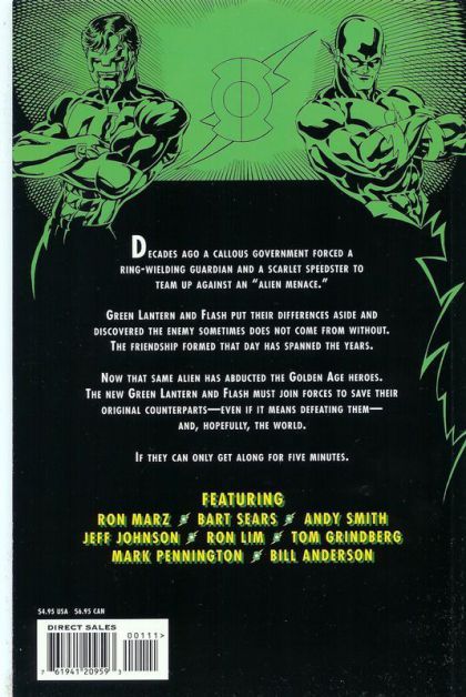 Decades ago, a callous government forced a ring-wiekding guardian and a scarlet speedster to team up against an "alien menace." Green Lantern and Flash put their differences aside and discovered the enemy sometimes does not come from without. The friendship formed that day has spanned the years. Now that same slien has abducted the Golden Age heroes. The new Green Lantern and Flash must join forces to save their original counterparts - even if it means defeating them - and, hopefully, the world. If they can only get along for five minutes.
