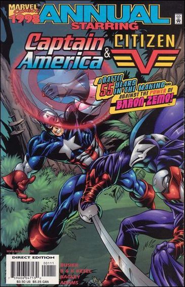 Spinning out of Avengers/Thunderbolts Month comes the first teaming of Marvel's two star-spangled sensations! In the heart of the jungle, Baron Zemo has unearthed the last of his father's discovery: Particle X--a threat that dates back to the World War II meeting between Captain America, Bucky and the original Citizen V! Now, to save the future, Cap and the mysterious new Citizen V must fight side-by-side against the might of Zemo--as the first revelations about V's identity come to the fore!