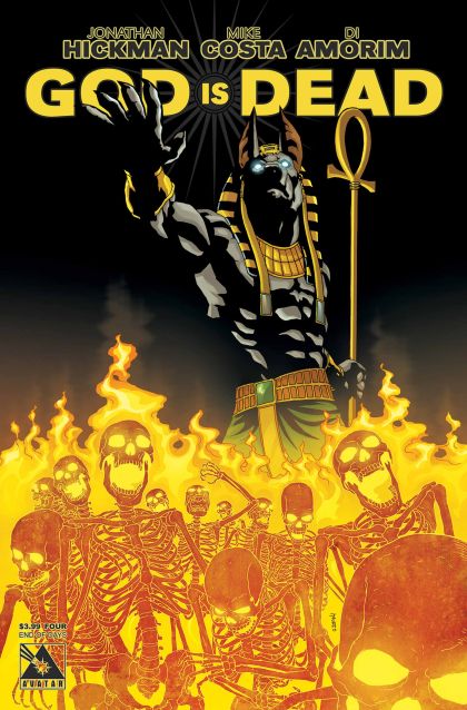 The End of Days has come! As the Asgardians destroy pantheon after pantheon in their quest for total domination, the human race's last hope is a desperate gamble to create their own god weapon. But when the divine turns out to be the Anti-Christ? it leaves very few options other than obliteration for all of human-kind. JONATHAN HICKMAN delivers a story like no other where the hubris of man is the only thing standing between freedom and eternal subjugation. The Book of Revelations is open before us and the end of the world can't be far behind. Available with a Regular cover by Jonathan Hickman, End of Days cover, a premium Iconic card stock cover that is limited to just 5000 copies by Jacen Burrows, and a Pantheon Order Incentive cover by series artist Di Amorim.