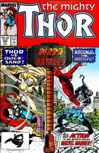 Hogun the Grim dies. And his killer is Daredevil! Where's Thor? In a fight for his life against Quicksand!