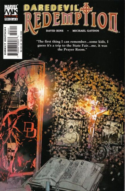 Written by David Hine Penciled by Michael Gaydos Cover by Bill Sienkiewicz Convinced that his client is innocent of the brutal, ritualistic killing of a local youth, attorney Matt Murdock now faces the legal battle of his career. It's an uphill battle ? and an outraged community eager to see justice served may be Matt's ? and Daredevil's ? most potent foe yet. Startling new evidence and a new suspect come to light, but an unexpected backlash during his nightly investigations as Daredevil forces Matt to ask: will a red devil's appearance in a God-fearing town just make matters worse? Don't miss this powerfully dark story by rising star David Hine (DISTRICT X) and critically acclaimed talent Michael Gaydos (POWERLESS, ALIAS), inspired by the true story of "The Robin Hood Hills Murders." 32 PGS./Marvel PSR ...$2.99 Cover price $2.99.