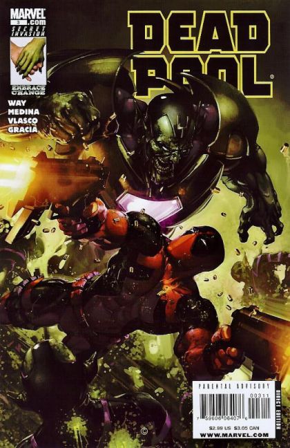 The Skrulls are invading, and are met at a baseball game by a non-human combatant who simply won't shut up. It's not long before the Merc with the Mouth finds himself face to face with the Skrull commander, proving once again that, if there's anything we can expect from Deadpool, it's for him to say and do the unexpected.