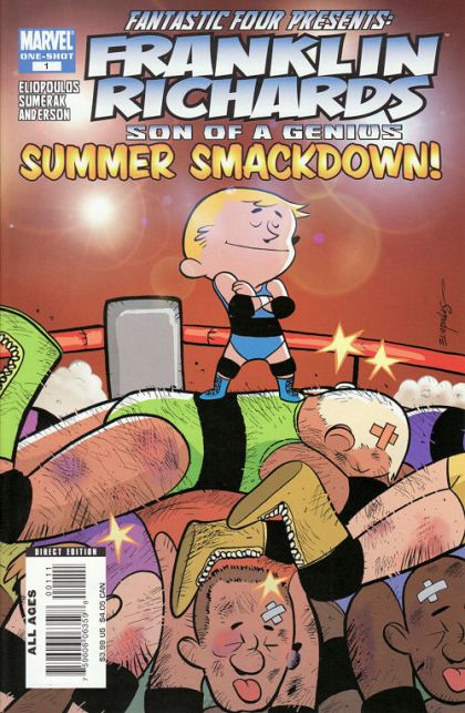 Written by MARC SUMERAK & CHRIS ELIOPOULOS Pencils & Cover by CHRIS ELIOPOULOS In this corner: wearing blue trunks and weighing in at 63 pounds -- the Baxter Building's Baby Boy -- FRANKLIN 'SON OF A GENIUS' RICHARDS! And in this corner: wearing tight spandex and weighing in at a whopping 500 pounds -- Aunt Petunia's favorite nephew -- BENJAMIN 'THE THING' GRIMM! It's the showdown of the century! And if Franklin survives the first round, he has four more challengers waiting in the wings ready to take his title! LET'S GET READY TO RUMBLE!!! 32 PGS./All Ages