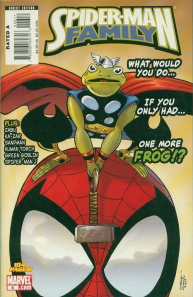 (ribbit) Time for a team-up, Spider! (ribbit) Let's see... Iron Man's busy (ribbit), Captain America's a little under the weather (ribbit), the FF are doing their own (ribbit) thing... who's not busy this month? (ribbit) FROG THOR!!!!!!! And while you're (ribbit) trying to figure out how a frog holds a (ribbit) hammer, you can read the classic (ribbit) archive material and Spider-Man J! 104 pages... best (ribbit) deal in comics!