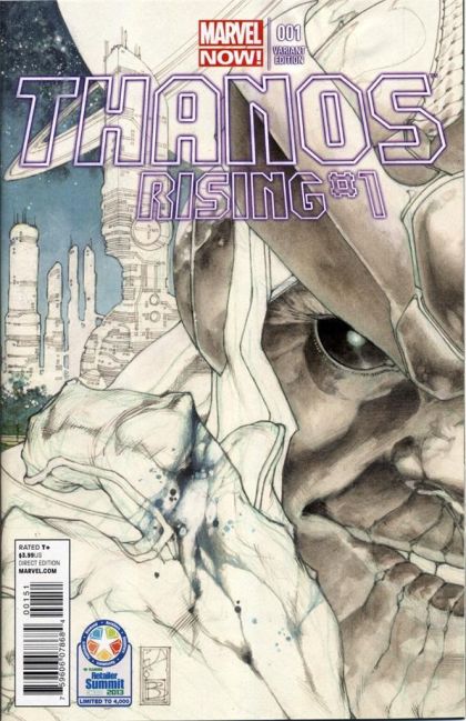- What comes after 'Marvel NOW!'? Whatever it is, it starts HERE. - The vile face left movie audiences in shock after last summer's Marvel Studios' 'The Avengers' movie, but who is this eerily disturbing villain? - Thanos rises as the unrivaled rogue of wretchedness in this gripping tale of tragedy, deceit and destiny. Where did this demi-god of death and destruction come from and...more importantly what does he want? - The answers come from the incredible creative team of Jason Aaron (Wolverine, X-Men Origins) and Simone Bianchi (Wolverine, Astonishing X-Men) as they take you on journey that will not only change the course of one boy's life... ...but will soon change the very nature of the Marvel Universe.