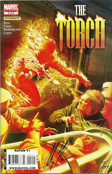 The return of the original Human Torch continues in this all-new all-exciting mini-series by Alex Ross, Mike Carey and Patrick Berkenkotter! Celebrate the red hot return of Jim Hammond, the Android Invader, with this fiery DF variant edition cover by Alex Ross, and it's signed by Mr. Ross, as well! Featuring DF original cover art by Alex Ross!