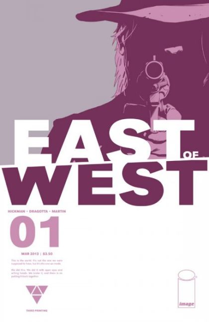 'OUT OF THE WASTELAND' The things that divide us are stronger than the things that unite us. A Sci-Fi Western set in a dystopian America where all hope for the future rests in the Four Horsemen of the Apocalypsewho just happen to be trying to kill the President of the United States. One of the most exciting new books of the year, this is EAST OF WEST, a brand new, ongoing, monthly comic from the award-winning team of Marvel's FF, JONATHAN HICKMAN and NICK DRAGOTTA.