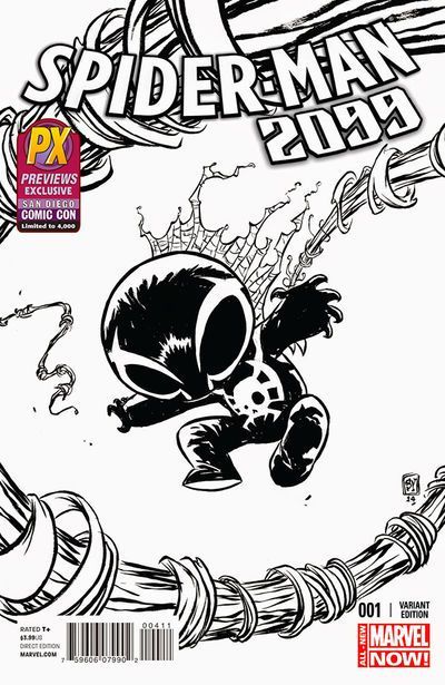 ALL-NEW SERIES FROM THE PAGES OF AMAZING SPIDER-MAN! The book you have been demanding for months finally hits the stands! Miguel O'Hara is Spider-Man in the year 2099 but he's currently stuck in the year 2014. He was stranded here by his father who is the head of an evil corporation called Alchemax in 2099. But in 2014, Alechmax has just been formed and Miguel has a chance to stop its corruption before it starts! You'd think being a man out of time would make you a man without enemies, but Spider-Man 2099 is about to discover that he's not the only one hoping for a better tomorrow, one that might be ensured by The Adjustor eliminating Miguel from the time stream altogether! Join comics legend (and Spider-Man 2099 creator) Peter David and breakthrough artist Will Sliney (Superior Spider-Man Team-up) for the most adventure you'll find in a book this side of the twenty second century!