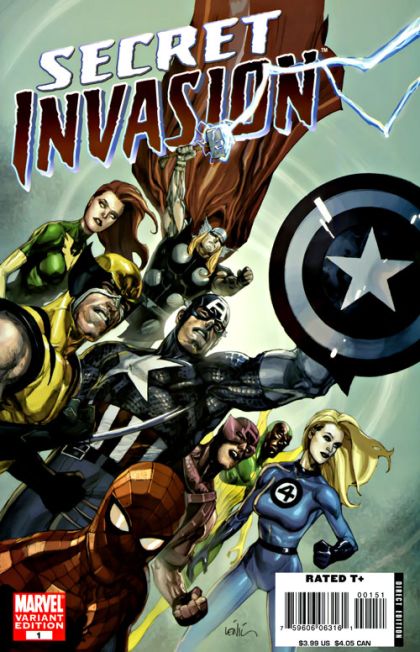 The Skrull agenda that has been hinted at for months is put into top gear. A lone Skrull craft lands in the Savage Land, and both teams of Avengers head in to investigate, despite their lack of trust for each other. The find the installation they were captured in back from New Avengers #5, in much worse repair than it used to be. They also find the Skrull craft, but before they can tear it open, a wave of attacks from Skrull agents strike down most human resistance, often accompanied by the mantra "He Loves You." Iron Man is felled by a virus, the orbiting S.W.O.R.D. installation is destroyed, the Baxter Building is sucked into the Negative Zone, Reed Richards is seriously wounded, and a spacecraft full of what appear to be heroes in old school costumes cracks open.