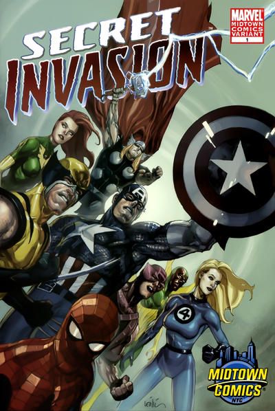 The Skrull agenda that has been hinted at for months is put into top gear. A lone Skrull craft lands in the Savage Land, and both teams of Avengers head in to investigate, despite their lack of trust for each other. The find the installation they were captured in back from New Avengers #5, in much worse repair than it used to be. They also find the Skrull craft, but before they can tear it open, a wave of attacks from Skrull agents strike down most human resistance, often accompanied by the mantra "He Loves You." Iron Man is felled by a virus, the orbiting S.W.O.R.D. installation is destroyed, the Baxter Building is sucked into the Negative Zone, Reed Richards is seriously wounded, and a spacecraft full of what appear to be heroes in old school costumes cracks open.