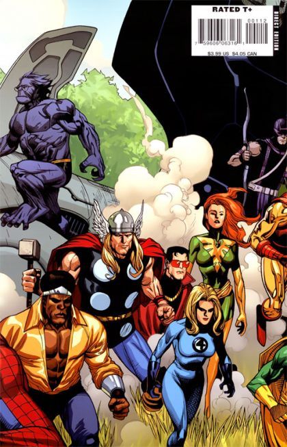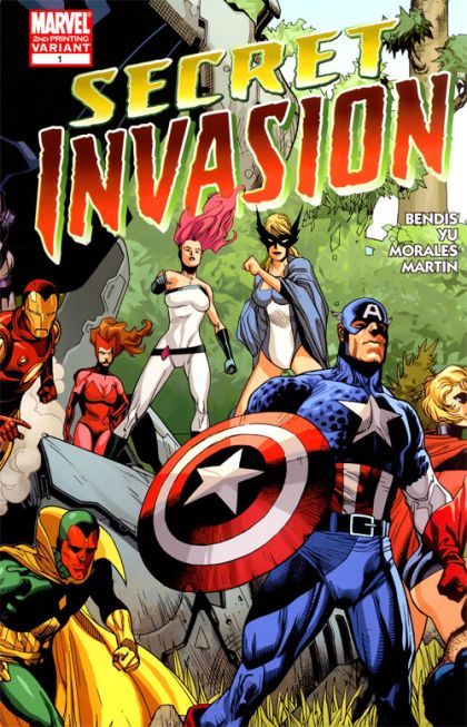 The Skrull agenda that has been hinted at for months is put into top gear. A lone Skrull craft lands in the Savage Land, and both teams of Avengers head in to investigate, despite their lack of trust for each other. The find the installation they were captured in back from New Avengers #5, in much worse repair than it used to be. They also find the Skrull craft, but before they can tear it open, a wave of attacks from Skrull agents strike down most human resistance, often accompanied by the mantra "He Loves You." Iron Man is felled by a virus, the orbiting S.W.O.R.D. installation is destroyed, the Baxter Building is sucked into the Negative Zone, Reed Richards is seriously wounded, and a spacecraft full of what appear to be heroes in old school costumes cracks open.
