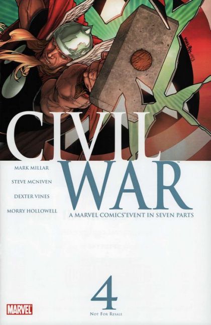 Captain America's anti-registration forces are dealt a punishing blow as Thor has apparently joined Iron Man's forces. They are only saved by the intervention of Susan Richards, who throws up a force field to protect them from Thor's lightning after the thunder god killed Goliath in battle.Heroes are leaving both sides after the battle. Some don't have the heart to continue fighting other heroes, while others feel that perhaps they aren't on the right side of the conflict. Spider-Man is much more withdrawn than normal, and is seen almost conspiring with Mary Jane and Aunt May.But though they've lost a few heroes, Captain America's forces are growing, and he has never been more determined to put a stop to tyranny than he is to oppose Iron Man. Tony has to come up with more forces if he's going to win the Civil War... but who can he turn to when the Heroes have all chosen their sides already?