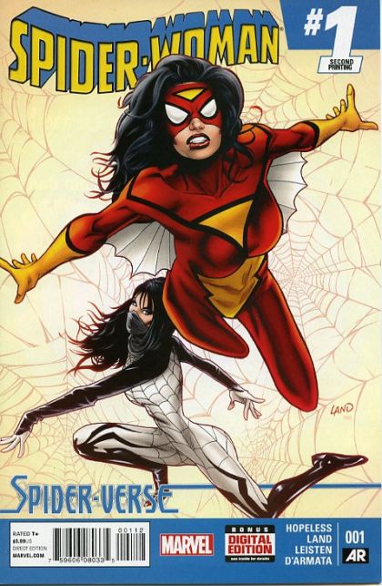 New Ongoing Series/Spider-Verse Tie-In! Jessica Drew has been an agent of S.H.I.E.L.D., and agent of S.W.O.R.D., an Avenger and so much more. But nothing could prepare her for the multidimensional insanity that is Spider-Verse! A war is brewing, and every spider-character in the multiverse is a target! But being a target is something Jessica Drew just won't abide. She's a woman with a mission and with Silk, the newest spider-character on the block at her side, she'll have to put all her training to the test if she wants to make it out of Spider-Verse alive! SPIDER-VERSE KICKS OFF A NEW ONGOING SERIES! - Dennis Hopeless (CABLE & X-FORCE, AVENGERS: ARENA) and Greg Land (UNCANNY X-MEN) bring you a universe spanning adventure starring Jessica Drew Spider-Woman and the newest spider-hero, SILK! Rated T+