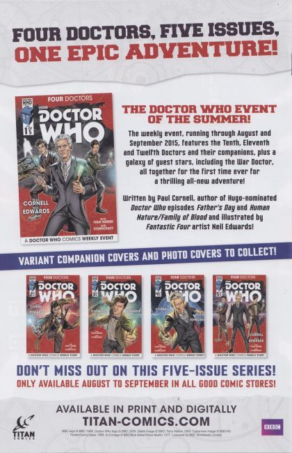 George Mann, the best-selling novelist behind the New York Times-bestselling Doctor Who: Engines of War and the Newbury and Hobbes series, joins the ongoing twelfth Doctor series for an extremely special issue! Mariano Laclaustra joins him in his first solo outing! Fresh from their adventures in Las Vegas, the Doctor and Clara are eager for a change of scenery, but their next destination aboard the TARDIS will prove a shocking change of pace! And coming up next issue: post-event, the twelfth Doctor's first year in comics concludes, with the return of a cosmic foe and a four-part epic climax to our first year by Robbie Morrison, Daniel Indro and Slamet Mujiono!
