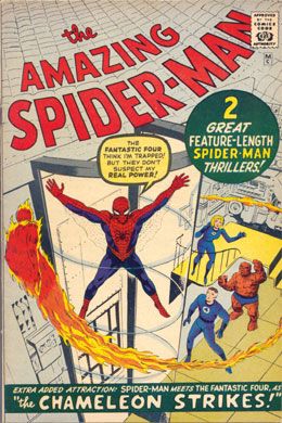 "Spider-Man" - after a quick recap of Spider-Man's origin from Amazing Fantasy #15, we get into the new story. The Parker family is very short on money, so Pete decides to go back to show business. Unfortunately, he's unable to cash a cheque made out to Spider-Man without legal identification in that name, so that doesn't work out very well. When J. Jonah Jameson starts writing editorials about how evil Spider-Man is, things get even worse. Spider-Man even saves Jonah's son John during a failed missile test, but Jonah doesn't let up, claiming Spider-Man sabotaged the test in the first place to garner attention for himself. "Spider-Man vs. The Chameleon" - In his next attempt for money, Spider-Man publically tries to join the Fantastic Four. This is when he learns they are a non-profit organization, and they aren't hiring or paying salaries. This does, however, draw the attention of the Chameleon, who then frames Spider-Man for his next robbery. Fortunately, Spider-Man manages to tear one of the Chameleon's costumes, revealing another underneath.