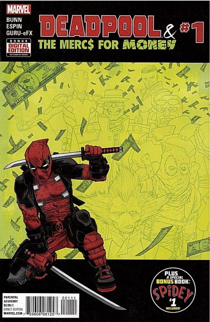 Deadpool might be an Avenger now, but he's also got his own private team of mercenaries...the legally-cleared-to-be-called MERCS FOR MONEY! Got a problem you can't solve on your own and a pile of money you'd like to be rid of? Just call Deadpool, Stingray, Massacre, Solo, Foolkiller, Terror and Slapstick and watch as that problem is shot, stabbed, eviscerated, pulverized and generally made bloody! Parental Advisory