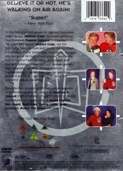 A special-ed teacher, an FBI agent, and a UFO? That's right, you've guessed it -- The Greatest American Hero. This show was first aired in 1981, and was both a comedy and a drama. A special "power suit" that only works on him is given to the teacher by the aliens, and he is paired up with the gumshoe FBI agent who keeps them both busy with his scenarios. The suit of "unearthly powers" gives the power of strength, flight, invisibilty, flames, telekenesis, vision of events without being there, protection from bullets and fire (if he remembers to cover his head!), and some others that he must figure out as well because; HE LOST THE INSTRUCTIONS THAT CAME WITH THE SUIT! Intro Theme: