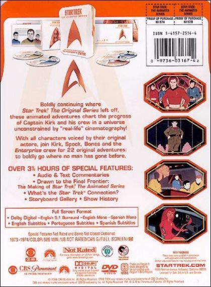 This is the further adventures of the Star Trek series in a half-hour animated form. This show basically continues the adventures of the original series (presumably in the fourth year of the five-year mission), but takes advantage of the unlimited special effects provided by animation to introduce more alien crewmen (the felinoid M'Ress and the tripedal Arex) as well as introduce more elaborate adventures like an underwater adventure, the miniaturization of the crew to 1 cm., and the appearance of a giant fire-breathing two-headed dragon. The show is currently not considered "canon" by Paramount and the folks associated with the various subsequent TV shows. However, elements of the animated series have been used in subsequent shows (Sarek refers to the events of "Yesteryear" in TNG's "Reunification Pt. 1") and the Enterprise-D's holodeck seems to have been in part inspired by the holodeck we see in "Practical Joker". Also, writers such as Peter David have used some elements from t