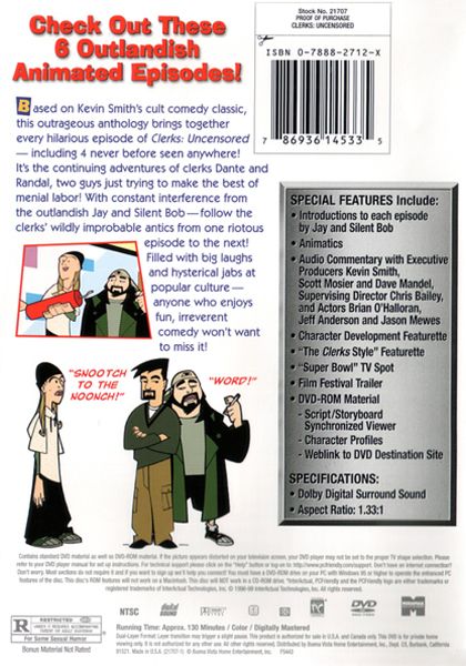 This animated series, based on Kevin Smith's 1994 film of the same name, centers on Dante Hicks and Randal Graves, the clerks at The Quick Stop and RST Video. These "slackers" spend most of their time spoofing pop culture and whining about their miserable lives. Adding color to their lives are the resident "hetero-life partners" Jay and Silent Bob, who hang out and sell fireworks outside the store.