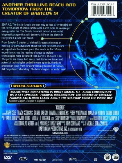 Crusade, a spin-off from the Emmy-winning Babylon 5, describes the efforts of the Interstellar Alliance vessel Excalibur to find the cure to a plague released on Earth. This plague of nano-viruses, released by the Shadow's servants the Drakh in retaliation for the Shadow War (see Babylon 5 movie a Call to Arms for details), will kill all mammalian life on Earth within five years if the cure is not found. Unfortunately, the plug was pulled on this series after just 13 episodes, so no resolution was ever achieved.