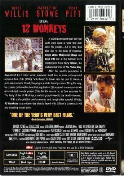 In the year 2035, convict James Cole reluctantly volunteers to be sent back in time to discover the origin of a deadly virus that wiped out nearly all of the earth's population and forced the survivors into underground communities. But when Cole is mistakenly sent to 1990 instead of 1996, he's arrested and locked up in a mental hospital. There he meets psychiatrist Dr. Kathryn Railly and the son of a famous virus expert who may hold the key to the Army of the 12 Monkeys; thought to be responsible for unleashing the killer disease.