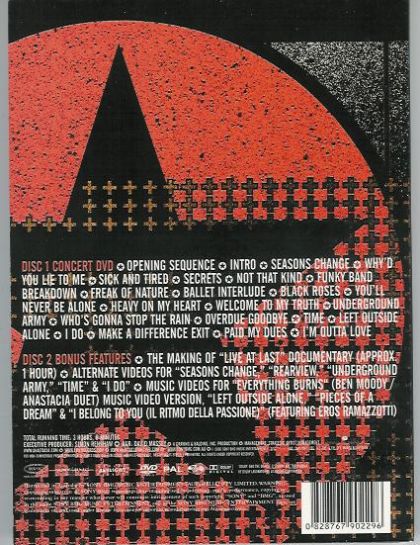 Anastacia: Live at Last is a DVD collection from pop/rock music singer Anastacia, released on March 27, 2006. It is her first full live concert DVD. It includes footage from her Live at Last tour concerts in Berlin (Velodrom – October 24, 2004) and Munich (Olympiahalle – October 26, 2004). 01. Opening Sequence 02. Intro 03. Seasons Change 04. Why'd You Lie To Me 05. Sick And Tired 06. Secrets 07. Not That Kind 08. Funky Band Breakdown 09. Freak Of Nature 10. Ballet Interlude 11. Black Roses 12. You'll Never Be Alone 13. Heavy On My Heart 14. Welcome To My Truth 15. Underground Army 16. Who's Gonna Stop The Rain 17. Overdue Goodbye 18. Time 19. Left Outside Alone 20. I Do 21. Make a Difference Exit 22. Paid My Dues 23. I'm Outta Love