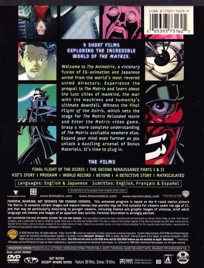 Straight from the creators of the groundbreaking Matrix trilogy, this collection of short animated films from the world's leading anime directors fuses computer graphics and Japanese anime to provide the background of the Matrix universe and the conflict between man and machines. The shorts include Final Flight of the Osiris, The Second Renaissance, Kid's Story, Program, World Record, Beyond, A Detective Story and Matriculated.