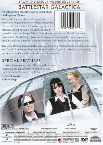 Caprica tells the story of a futuristic human society that is at its technological peak; the inhabitants of this society are successful, oblivious and self-absorbed. When the society is attacked by terrorists and loved ones die, several members of the society want to use technological advances to resurrect the dead. When Daniel Graystone (Eric Stoltz), a computer whiz, and his wife Amanda (Paula Malcolmson) lose their daughter Zoe (Alessandra Toressani) in the attack, they resurrect her in robotic form using her remains. This use of technology creates an ideological chasm in the society, especially as more and more humans start to create their own “Cylons” – cyborg versions of humans. Joseph Adama (Esai Morales) is a man who also loses loved ones in the attack, but who does not believe in using this new technology to resurrect the dead.