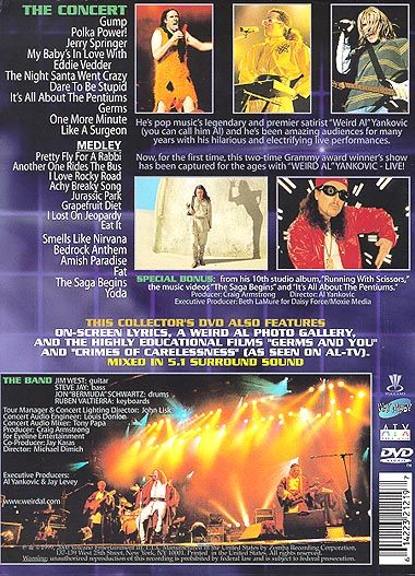 Live video recording of "Weird Al" Yankovic's concert during the Touring With Scissors tour, at the Marin County Civic Center, in San Rafael, California, on October 2, 1999.