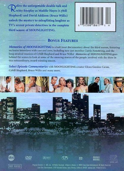 When former fashion model Maddie Hayes goes broke and finds that one of her few remaining assets is ownership of the Blue Moon Detective Agency, she is tempted to liquidate it until she meets the quirky employees and gets involved in their even quirkier cases. Moonlighting as a series was plagued by production delays and erratic scheduling. Scheduled episodes were often delayed for weeks and reruns substituted at the last minute. Many in-jokes and short fill-in pieces refer to this and other topical items at the beginning and end of some programs. Episodes 35 - 39 were particularly affected by this, and in their original broadcast contained intros dealing with the slow production pace.