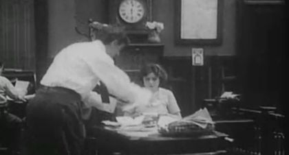 "Grandpa sits nodding in his armchair in the kitchen, where a sout, jolly washerwoman is washing clothes. While the woman leaves the tub to talk to a book agent, a small boy enters, and ties grandpa's chair to a towel which is hanging over the tub. The washerwoman begins vigorously wringing the clothes. The towel is drawn into the wringer, and as grandpa is sitting with his feet on the stove and the chair tilted back, a collision is brought about by the towel pulling grandpa and the tub together. This is a crowning success as a comic picture."—Edison Catalog