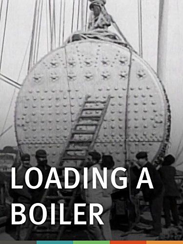 A stationary camera placed amidships looks toward the round end of a 10- or 12-foot boiler that's been loaded onto the open deck. Three men climb down from atop the boiler and then remove their ladder. Four or five other workers tie the boiler down to the deck. Their pace is leisurely. In the background is a busy harbor.
