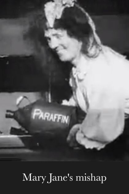 Mary Jane tries to light the oven. When she's unsuccessful, she plays around, getting black boot polish on her face. She mugs before a mirror. Then, it's back to work. When the stove still won't light, she pours in paraffin, winks at the camera, and lights a match. Kaboom! Is there any rest for the foolish, even in the grave?