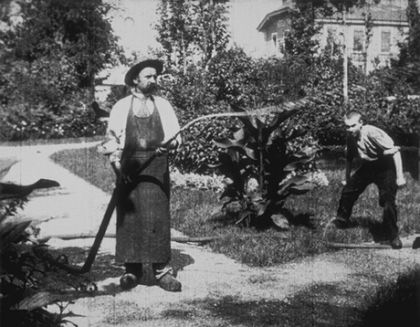 A gardener is watering his flowers, when a mischievous boy sneaks up behind his back, and puts a foot on the water hose. The gardener is surprised and looks into the nozzle to find out why the water has stopped coming. The boy then lifts his foot from the hose, whereby the water squirts up in the gardener's face. The gardener chases the boy, grips his ear and slaps him in his buttocks. The boy then runs away and the gardener continues his watering. Three separate versions of this film exist, this is the third version.