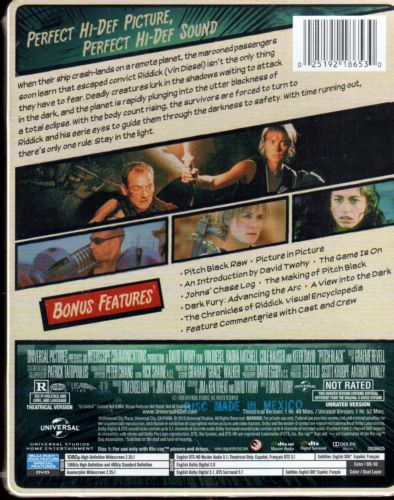 When their ship crash-lands on a remote planet, the marooned passengers soon learn that escaped convict Riddick isn't the only thing they have to fear. Deadly creatures lurk in the shadows, waiting to attack in the dark, and the planet is rapidly plunging into the utter blackness of a total eclipse. With the body count rising, the doomed survivors are forced to turn to Riddick with his eerie eyes to guide them through the darkness to safety. With time running out, there's only one rule: Stay in the light.